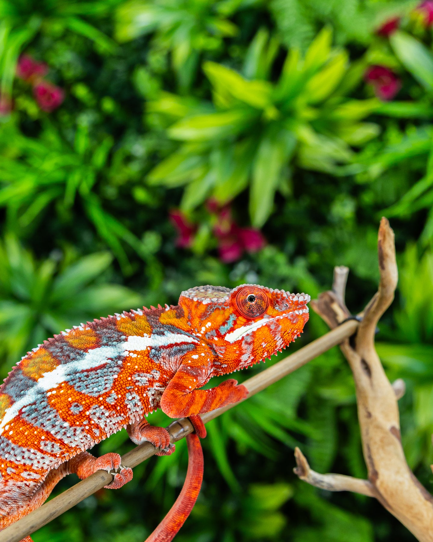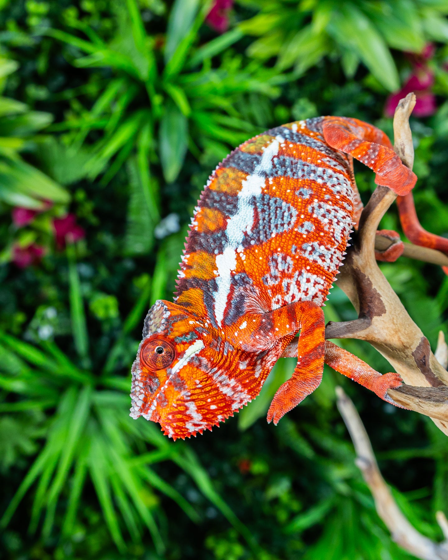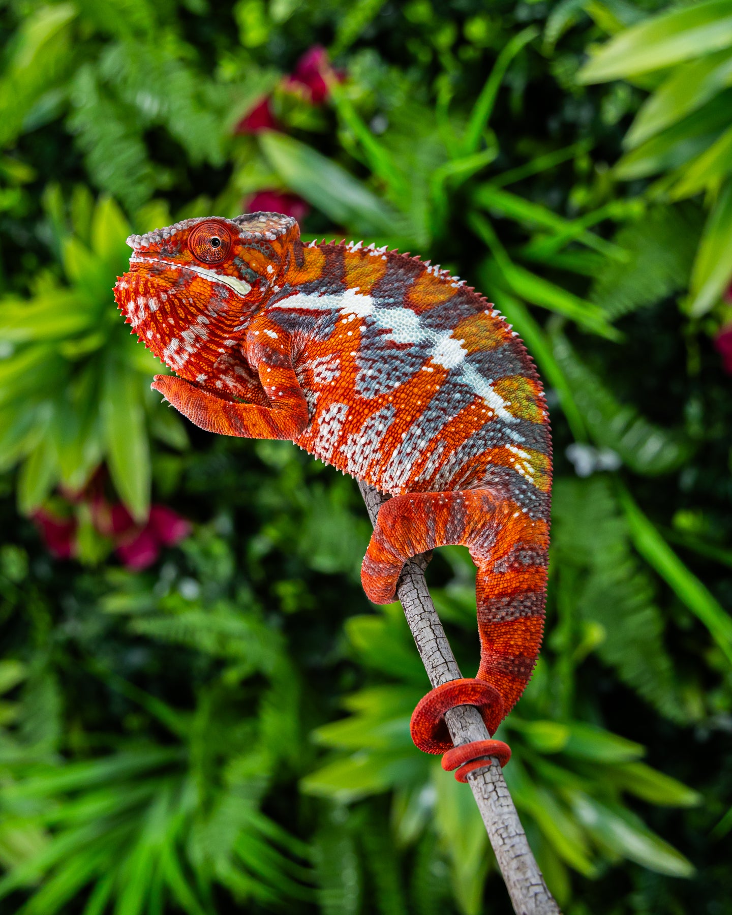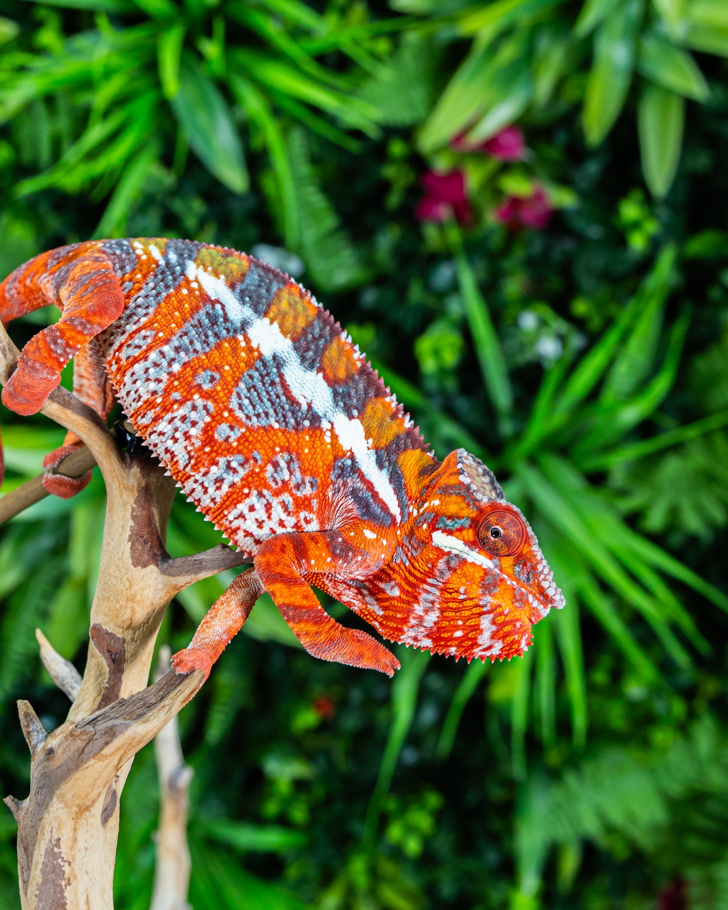 The Ambilobe panther chameleon comes from the Ambilobe region of northern Madagascar and is known for its bold, high-contrast coloration. This locality commonly displays vibrant combinations of red, blue, green, yellow, and orange, often with clearly defined vertical bars.